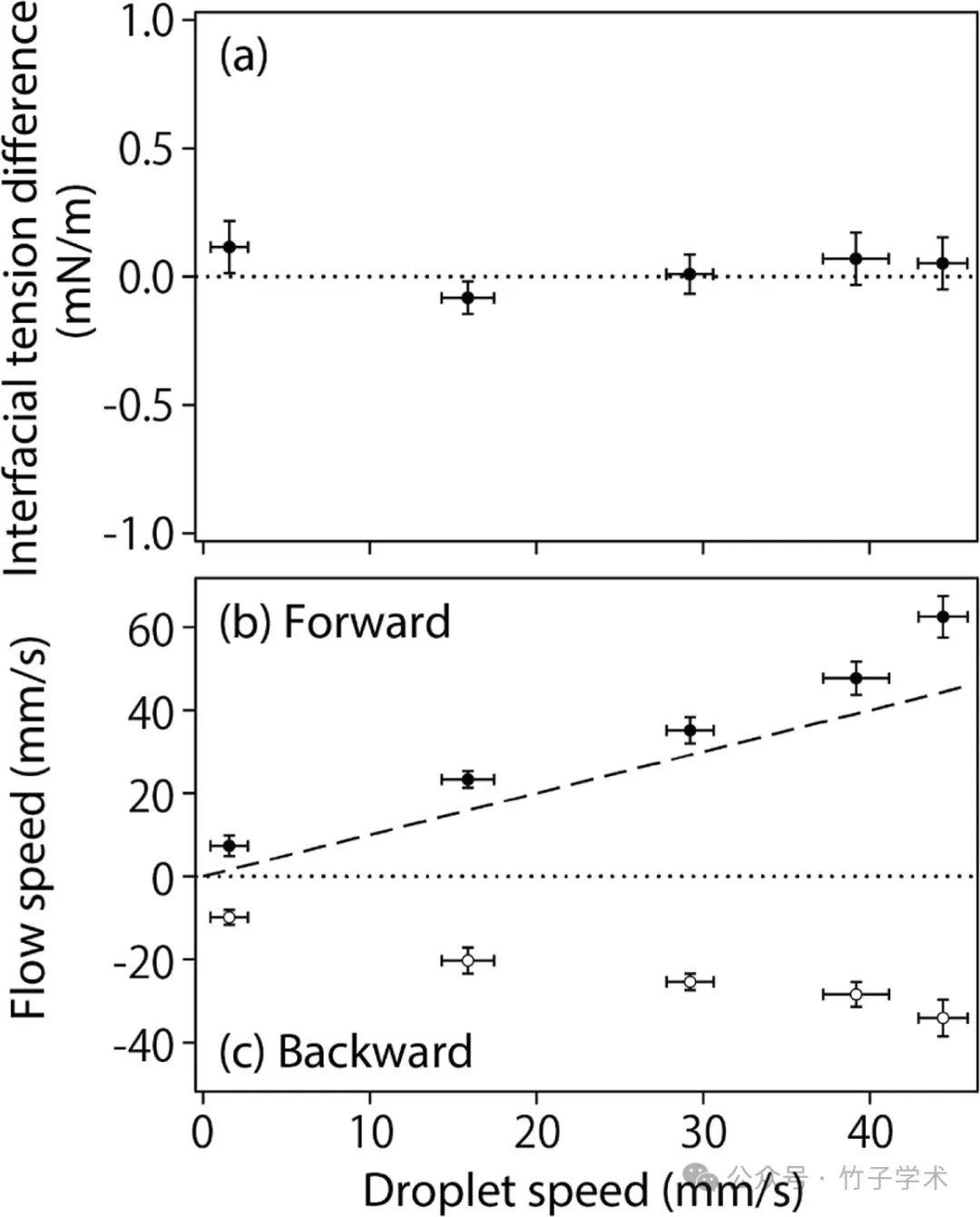 圖5是液滴速度與(a)液滴前后部之間的界面張力差、(b)向前流動速度(實心圓圈)和(c)向后流動速度(空心圓圈)的關系。水平虛線表示零,虛線表示液滴速度與前進流速相同時的情況。