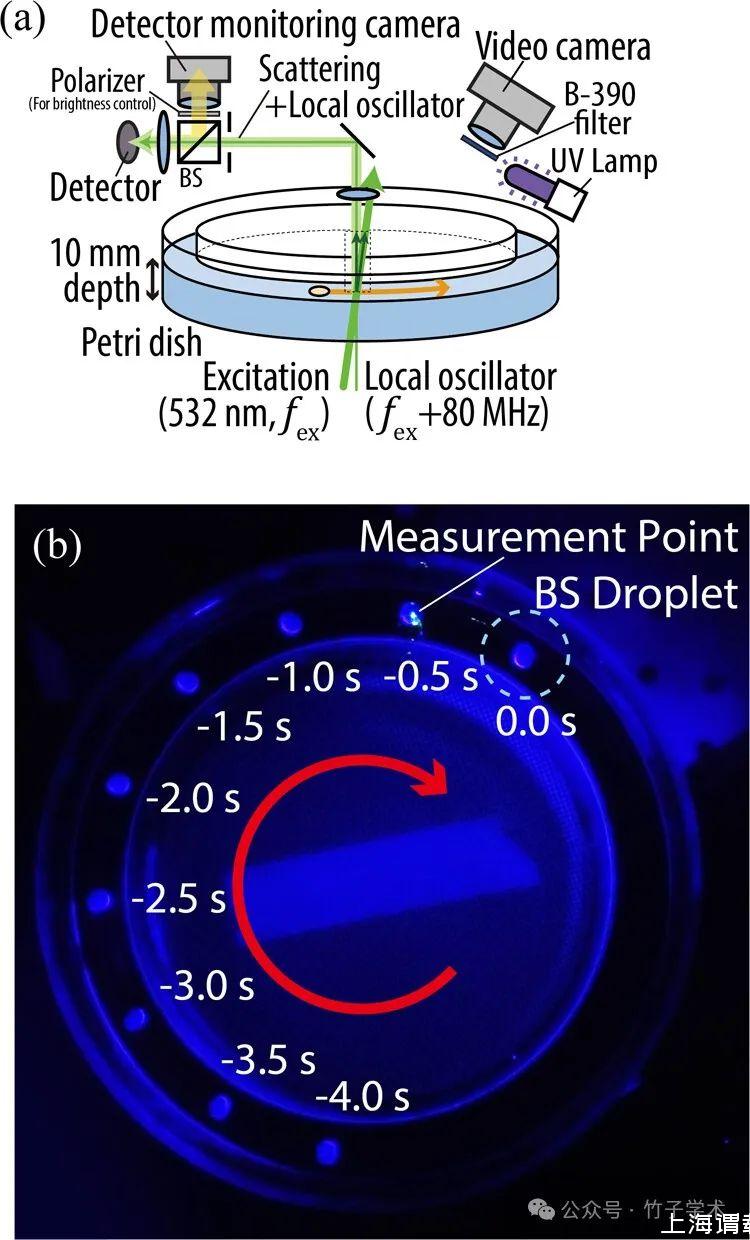 圖1(a)用于研究自驅動液滴和QELS測量的實驗安排概述。BS代表分束器,其透射率/反射率之比為90:10。(b)60 mM SDS溶液上移動的自驅動液滴和測量點的重疊熒光圖像。