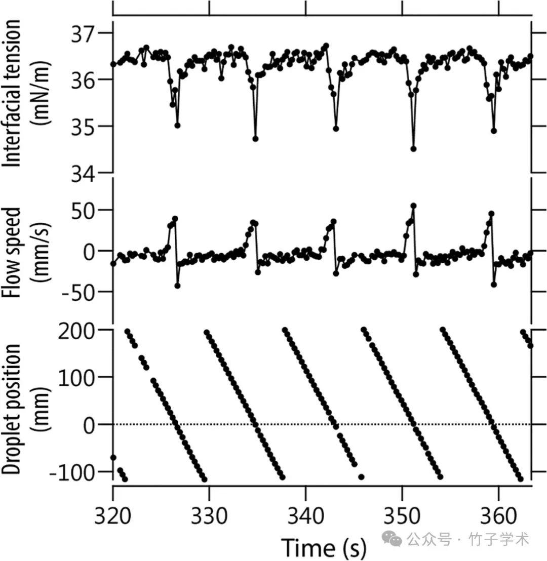 結果,當液滴通過時間分辨測量的采樣位置時,觀察到界面張力的周期性減小以及向前和向后流動的速度的周期性增加。當它們轉換為液滴位置的空間分布時,沒有觀察到液滴前后界面張力差對液滴速度的依賴性。另一方面,隨著液滴速度的增加,向前和向后流動的速度都增加。通過簡化模型對上述結果的分析,表明液滴前沿界面張力梯度驅動的前向流動實際上在液滴單向自推進運動機制中發揮著重要作用。