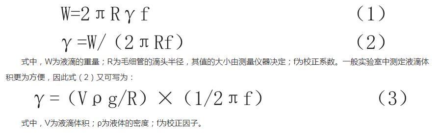 滴體積法的基本原理是這樣的,利用毛細管滴頭,緩慢往下滴液體,這時候測量液滴的大小,就能測定液體的表面張力。這是因為液體的表面張力,與從毛細管滴下的液滴的大小有內在關聯,存在正比關系,這個關系可以用數學公式表達: