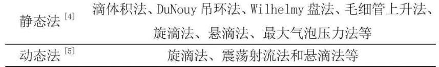 液體表面張力可以通過儀器測定,目前測定方法大體上分為動態法和靜態法。這兩大類方法下面由于細分,具體分類如表1。