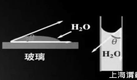 在實際工作中,通常會用到接觸角結合γg-l氣-液界面張力來判斷鋪展過程是否自動進行。接觸角,是指在固相、液相、氣相這三相的交界點,兩個界面張力(氣-固界面與氣-液界面)之間的夾角,通常用θ表示。如圖1,將水滴滴到玻璃上,接觸角如圖所示。