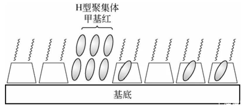 兩親性環(huán)糊精不僅能夠單獨(dú)組裝成LB膜,也能夠和其他有機(jī)分子共同組裝成雜化LB膜。Matsumoto課題組在兩親性環(huán)糊精和偶氮苯LB雜化膜方面做了大量的工作。因?yàn)榕嫉交衔锬軌蛟诠庹諚l件下發(fā)生可逆的順?lè)垂猱悩?gòu)反應(yīng),若將偶氮苯在固體基底上進(jìn)行組裝將對(duì)光儲(chǔ)存、光轉(zhuǎn)換器件的發(fā)展具有十分重要的意義。但是由于在單純LB膜中,偶氮苯分子周圍自由體積很小,限制了順?lè)垂猱悩?gòu)反應(yīng)的發(fā)生,而利用兩親性環(huán)糊精和偶氮苯雜化組裝成LB膜以解決這個(gè)問(wèn)題。研究表明部分偶氮苯被包結(jié)在環(huán)糊精的空腔中,空腔為水溶性偶氮苯發(fā)生可逆的光異構(gòu)化反應(yīng)提供了良好的場(chǎng)所。此外,環(huán)糊精疏水鏈段也能夠成為容納客體分子的場(chǎng)所,而且在膜中并非所有的環(huán)糊精分子都會(huì)包結(jié)偶氮苯分子,剩余的未包結(jié)環(huán)糊精為進(jìn)一步功能化提供了基礎(chǔ)。但是在該雜化膜中會(huì)有部分偶氮苯分子形成的聚集體(圖2),所以進(jìn)一步增加雜化分子的包結(jié)率和分散性是這一類雜化膜的研究方向。