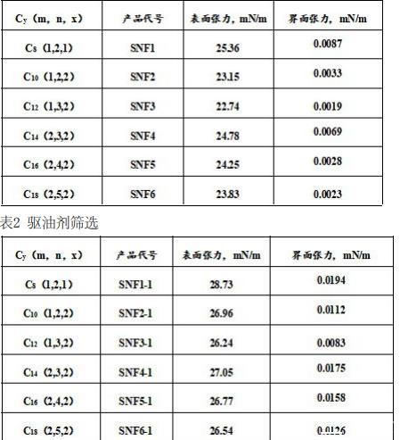 制得的驅(qū)、滲一體化驅(qū)油劑(SNF1至SNF6)的表面張力和界面張力,測試條件:60℃、5000rpm,濃度均為0.2%,測試結(jié)果見表1。表1中,y是驅(qū)、滲一體化驅(qū)油劑的親油碳鏈主鏈長度,m是對苯乙烯磺酸鈉的反應(yīng)系數(shù),n是丙烯酰胺的反應(yīng)系數(shù),x是氟碳陽離子疏水單體的反應(yīng)系數(shù)。