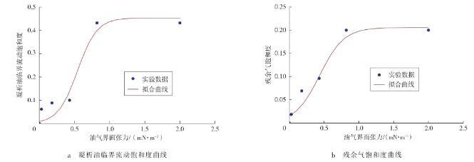 圖3凝析油臨界流動(dòng)飽和度、殘余氣飽和度隨界面張力變化的回歸曲線