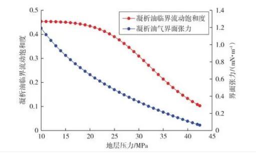 圖4凝析油臨界流動(dòng)飽和度和界面張力隨壓力的變化