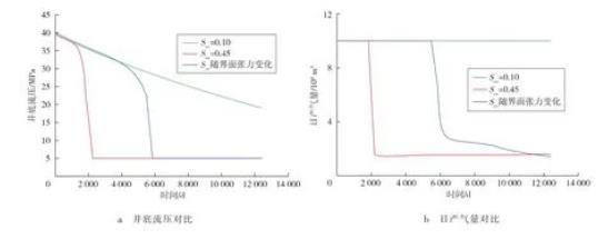 設(shè)計(jì)機(jī)理模型和數(shù)值模擬方案,建立組分模型分析變凝析油氣臨界流動(dòng)飽和度對開發(fā)指標(biāo)預(yù)測的影響,模型網(wǎng)格為50×50×7,滲透率為10×10-3μm2,孔隙度為15%,地質(zhì)儲(chǔ)量為10×108m3。設(shè)計(jì)日產(chǎn)氣量為10×104m3,最小井底流壓為5 MPa,以及Scc=0.10、Scc隨界面張力變化及Scc=0.45時(shí),預(yù)測凝析油臨界流動(dòng)飽和度及不同方案的生產(chǎn)特征。