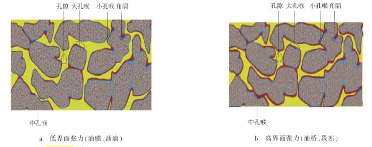 凝析氣藏開發(fā)過程中伴隨著油氣界面張力σog的變化,當(dāng)?shù)貙訅毫Ω哂诼饵c(diǎn)壓力時(shí),處于混相狀態(tài),油氣界面張力接近0 mN/m;當(dāng)?shù)貙訅毫β缘陀诼饵c(diǎn)壓力時(shí),出現(xiàn)反凝析現(xiàn)象,少量凝析油析出,此時(shí)油氣界面張力較小,析出的凝析油以油膜狀態(tài)附著在束縛水之上,即以油膜鋪展方式分布于儲(chǔ)層中。在曲率較大的孔隙角隅處,由于毛細(xì)凝聚作用,以油滴方式分布,凝析油易流動(dòng),實(shí)驗(yàn)測量的凝析油臨界流動(dòng)飽和度一般小于10%[14](見圖1a);隨著凝析氣藏的開發(fā),當(dāng)?shù)貙訅毫h(yuǎn)低于露點(diǎn)壓力時(shí),大量凝析油析出,油氣界面張力迅速增加,到最大反凝析壓力時(shí)的界面張力可比露點(diǎn)壓力時(shí)的高2個(gè)數(shù)量級[4]。析出的凝析油大部分以段塞的形式分布于孔隙喉道與角隅,相對于凝析油膜更難以流動(dòng),凝析油臨界流動(dòng)飽和度增大(見圖1b)。