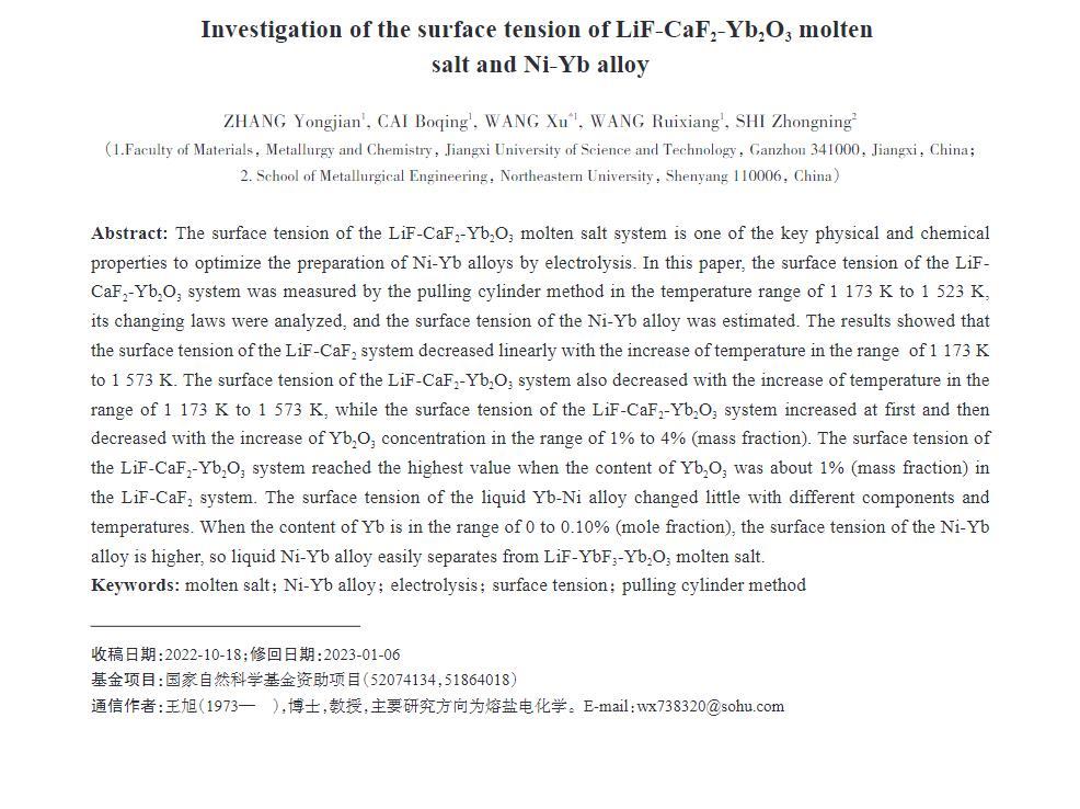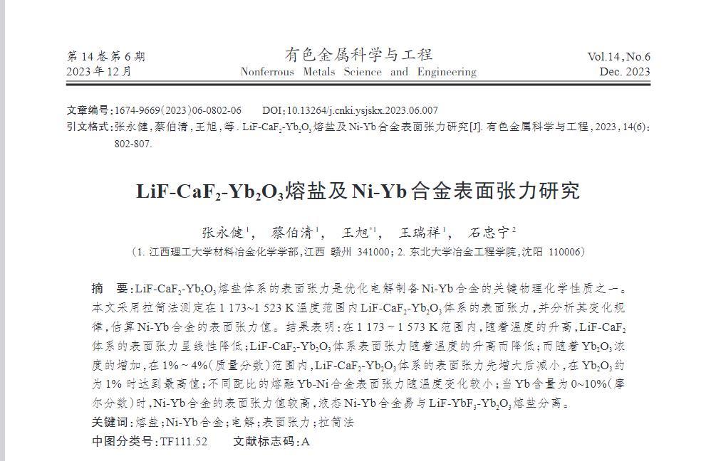 LiF-CaF2-Yb2O3熔鹽體系的表面張力是優化電解制備Ni-Yb合金的關鍵物理化學性質之一。本文采用拉筒法測定在1173~1523 K溫度范圍內LiF-CaF2-Yb2O3體系的表面張力,并分析其變化規律,估算Ni-Yb合金的表面張力值。