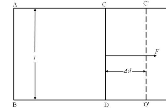 研究液體表面張力隨液體濃度、溫度、壓強(qiáng)等的變化規(guī)律的論著很多,卻很少有人研究液體表面張力隨液面拉伸程度的變化規(guī)律,從而隱喻了一種結(jié)論,即液體在濃度、溫度、壓強(qiáng)等條件不變時(shí),其表面張力的大小不會(huì)隨其表面被拉伸的程度而改變。多部專(zhuān)著都有這樣的經(jīng)典的論述,圖1所示的矩形金屬絲框覆有液膜,其中CD為活動(dòng)邊,長(zhǎng)為l,欲使體系平衡,必須施以適當(dāng)?shù)牧于CD邊上。CD邊在力F作用下克服液膜表面張力的阻礙而移動(dòng)距離Δd,對(duì)體系做功ΔA=F×Δd,F(xiàn)=2γ×l,γ=F/2l為CD邊的液體表面張力系數(shù)。在此論述中,先驗(yàn)地將液體表面張力視為不隨液膜面積變化而改變的恒量。