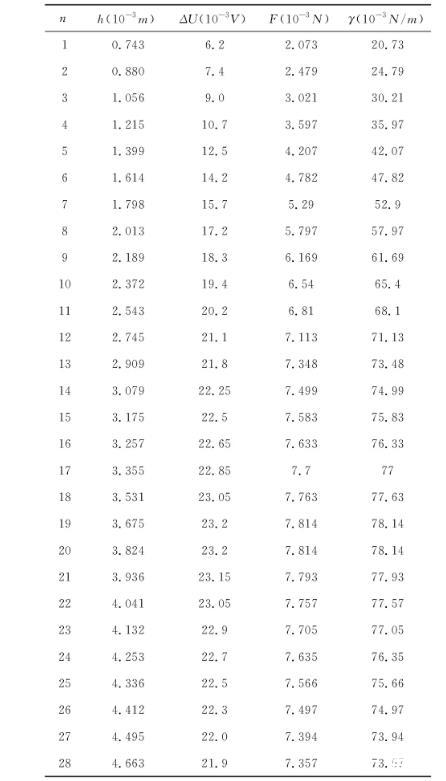 將拉力框置于待測(cè)液體中,調(diào)節(jié)好刀口與液面的平行度。讓液面緩慢上升至與刀口接觸。然后下降液面,形成并拉伸液膜至液膜斷裂。記錄此過(guò)程中液面在不同高度(即液膜不同拉伸長(zhǎng)度)時(shí)的位置及此時(shí)力敏傳感器的讀數(shù)U,根據(jù)f=kU,(力敏傳感器的轉(zhuǎn)換系數(shù)k=340.2×10-6N/mV),可計(jì)算出不同高度的受力大小fn。