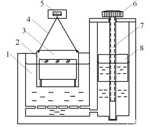 新型表面張力測(cè)試儀基本結(jié)構(gòu)如圖2所示,該儀器盛有液體(1),儀器采用連通器結(jié)構(gòu),截面積較大的左端放置拉力框(3),截面積較小的右端設(shè)有升降塊(8),旋動(dòng)栓鈕(6)和螺桿(7),可使升降塊(8)上升或下降,從而引起液面相應(yīng)的但速度更緩慢的升降。為減小液面升降時(shí)的波動(dòng),容器的兩端通過(guò)若干均勻分布的小孔相連通。為便于觀測(cè)液面位置,容器壁采用透明的有機(jī)玻璃材料,通過(guò)讀數(shù)顯微鏡確定液面高度。