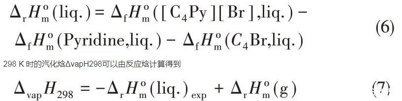 2013年,Verevkin等[65]用差示掃描量熱法測定了吡啶和吡咯烷基ILs合成的反應焓和ILs的汽化焓。差示掃描量熱法(DSC法)廣泛用于化學反應的動力學和熱力學研究,他們在之前的工作中報道了差示掃描量熱法可以作為測量ILs熱力學性質的合適的實驗工具,能夠間接得到汽化焓[66-67]。