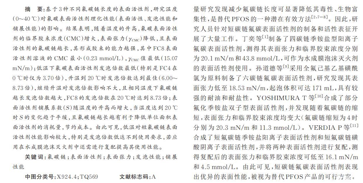 基于3種不同氟碳鏈長(zhǎng)度的表面活性劑,研究溫度(0——40℃)對(duì)氟碳表面活性劑理化性能(表面活性、發(fā)泡性能和鋪展性能)的影響。