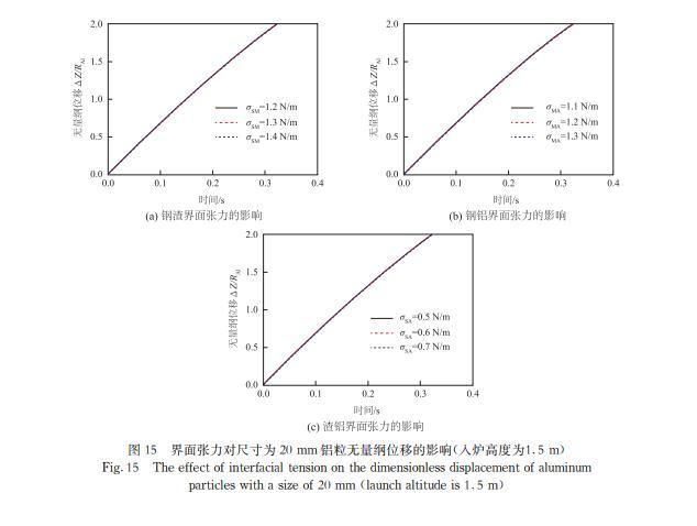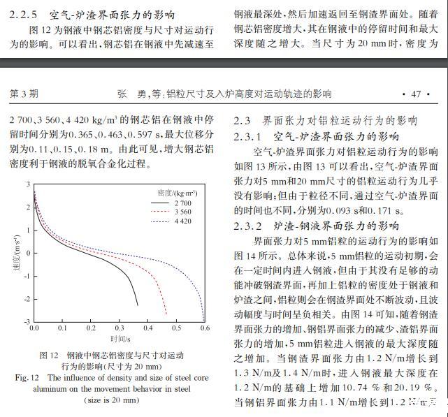 增加鋼渣界面張力、減小鋼鋁界面張力或增加渣鋁界面張力有利于鋁粒進入鋼液,而鋁粒的尺寸大于20 mm,界面張力對鋁塊運動幾乎沒有影響;增大密度會使鋼芯鋁在鋼液中停留更長時間,有利于鋼液脫氧。