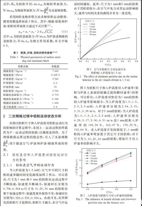 結果表明:在渣層厚度為70 mm且入爐高度為1~1.5 m的情況下,1 mm和5 mm的鋁粒在渣鋼界面處波動;入爐高度為1 m時,粒徑為10 mm的鋁粒停留在渣鋼界面處,但在入爐高度為1.5 m及以上時可以進入鋼液;20 mm及以上尺寸的鋁粒可以進入鋼液。在入爐高度為1 m時、30 mm尺寸的鋁粒在鋼液中的停留時間與深度相較于20 mm的基礎上分別增加22.86 %和50.00 %;在鋁粒尺寸為20 mm時、入爐高度為1.5 m時的鋁粒在鋼液中的停留時間與深度在1 m的基礎上分別增加5.71 %和10.00 %。