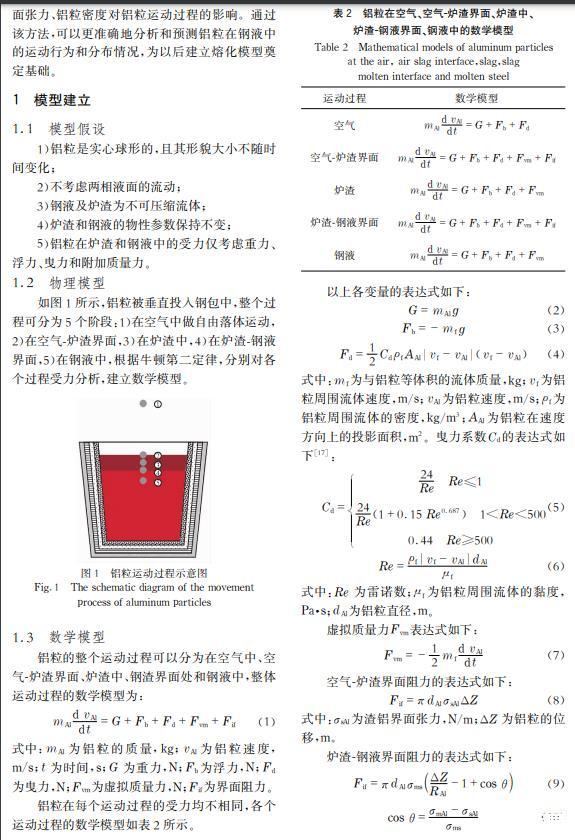 摘要: 二次精煉過程中,鋁是鋼液進行脫氧及合金化的主要物料之一,但純鋁的密度小于鋼液,能否穿越渣層與鋼液接觸及接觸時間對鋁的脫氧效果和鋼中溶解鋁的含量有直接影響。在忽略鋁的熔化、溶解及化學反應的情況下,通過對鋁粒運動過程受力分析,建立鋁粒在氣-渣-鋼相內的三維運動數學模型,明晰鋁粒尺寸及入爐高度對鋁粒運動軌跡的影響。