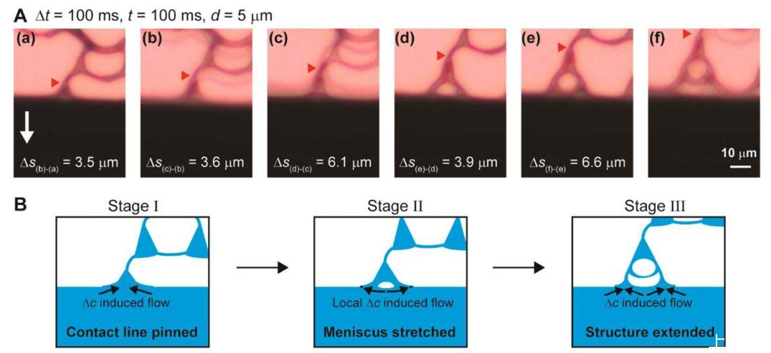 揭示自發(fā)結(jié)構(gòu)形成的細(xì)節(jié) 超支化結(jié)構(gòu),我們采用原位顯微鏡[圖。 3(A)]。 視頻圖像顯示超分支 結(jié)構(gòu)通常分三個(gè)階段形成[圖。 3(B)]。 我們注意到,由于我們的彎液面的動(dòng)態(tài) 過程中,我們很難測(cè)量波長(zhǎng) 動(dòng)態(tài)彎液面。 在第一階段,手指平行于 由于馬蘭戈尼不穩(wěn)定性而出現(xiàn)流動(dòng)方向 和摩擦。 重要的是,三角形半月板將手指連接到半月板前部。 由于手指是 與本體溶液相比,PS 的濃度更高, 手指的表面張力相對(duì)較高,拉入 本體溶液,具有較低的表面張力。 這一步是 如圖3(B)(a)所示。