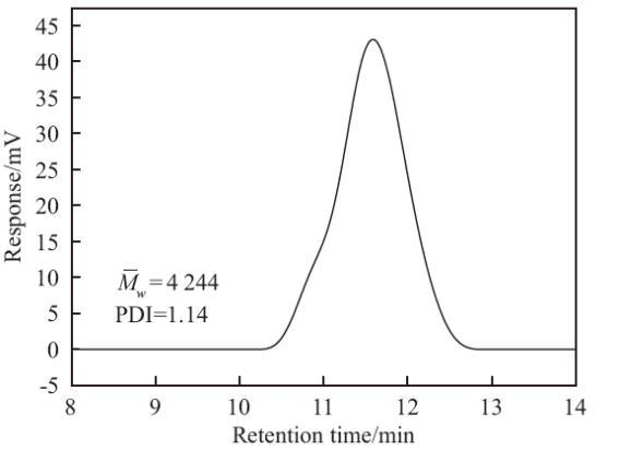 圖1為HS-PA的相對分子量以及分散性指數PDI。由圖1可知,聚醚-聚丙烯酸/酯高分子表面活性劑的GPC圖呈單峰分布,重均分子量為4 244,PDI為1.14,表明其為均一的聚合物,且分子量分布較為均勻。