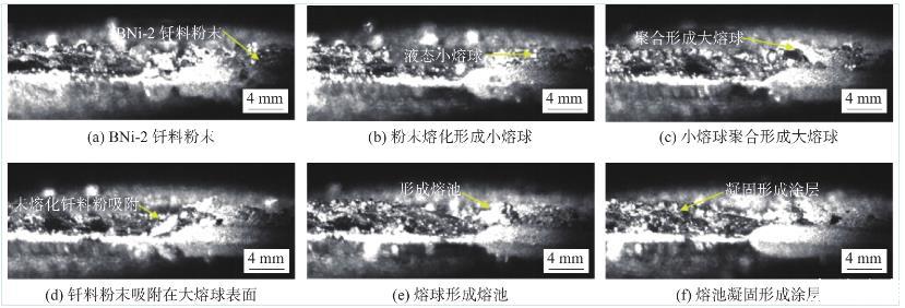 圖3是激光釬涂過程中的超高速攝影照片(4000幅/s),直觀地表征了激光釬涂過程中釬料粉末在激光作用下熔化、鋪展、凝固的過程。從圖3中可看出,在激光釬涂過程中,釬料呈現4種狀態,分別為粉末態、熔球態、熔池態、凝固態。在激光未掃描的位置,釬料保持原始的粉末狀態,如圖3a所示。被激光束掃到的位置,粉末態的釬料吸收能量,升溫熔化,形成尺寸較小的液態熔球,如圖3b所示。隨后,粉末釬料的不斷熔化形成更多液態小熔球,尺寸較小的熔球互相結合匯聚成尺寸較大的液態熔球,如圖3c所示。同時可觀察到未熔化的釬料粉末在液/固界面張力作用下,逐漸被吸附到尺寸較大的熔球表面,如圖3d所示。隨著激光逐漸向前掃描,熔球不斷長大,當熔球固相表面張力與重力的合力作用大于液/固界面張力后,大尺寸熔球在基體鋪展潤濕,形成熔池,如圖3e所示。最后,隨著激光熱源的移動,激光后端的熔池溫度逐漸降低,液態釬料逐漸凝固,在基體表面形成涂層,如圖3f所示。
