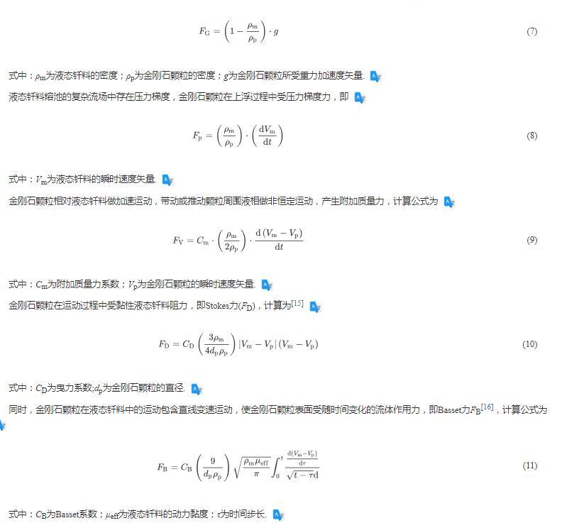 對于液態釬料熔池中存在復雜流場,金剛石顆粒上浮過程中存在重力和浮力的共同作用,計算公式為