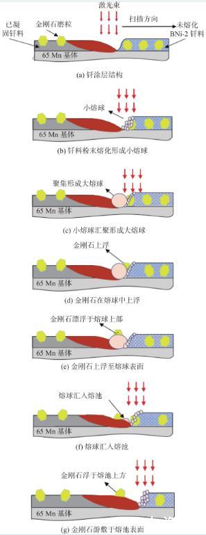 在激光釬涂過程中,金剛石散布于釬料中,釬涂后金剛石位于釬料表層,如圖5所示,可見經過激光熱源作用,金剛石顆粒遷移至釬涂層表面位置,并突出于釬涂層。為了明確金剛石在激光釬涂中的運動過程,深入分析了金剛石在激光釬涂過程中的運動行為。