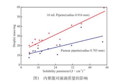對于純物質的溶解度參數可通過文獻查閱、基團貢獻計算法和液體熱力學關系式計算。而礦物油為混合物,很難查到或者估算它的溶解度參數。文獻提供了一種溶解度參數的估算法:稱量10~20滴液體,然后計算每滴液體的平均質量;另取2種已知溶解度參數的非揮發性液體作為參照,通過做圖大致計算出液體的溶解度參數。實驗需保持恒溫。分別通過內徑為0.916 mm的10 mL移液管和內徑為0.705 mm的巴斯德移液管移取液滴,得到兩條溶解度參數與液滴質量的關系曲線。內聚能對液滴質量的影響見圖1。由圖1可見,液滴的質量與液體溶解度參數成線性關系。該估算方法可用來計算混合液體的溶解度參數,適用于礦物潤滑油溶解度參數的計算。雖然估算方法過于粗糙,但為估算礦物油等復雜混合物的溶解度參數提供了思路。文獻介紹了液滴的大小與液體表面張力有關。由此可見,溶解度參數與表面張力存在一定的關系。