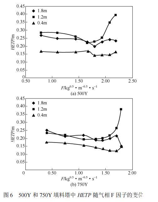 (1)在一定負荷范圍內,750Y填料的分離效率優于500Y填料,但單位填料高度的壓降高于500Y填料,導致操作穩定性比500Y填料差,處理量比500Y填料小。