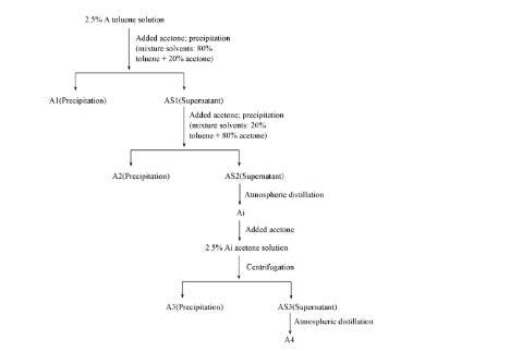 1.2.1瀝青質(zhì)及其亞組分的分離利用正己烷沉淀出原油中的瀝青質(zhì)A.利用混合溶劑(甲苯和丙酮)沉淀法,將A分為4個不同的亞組分,分離流程如Scheme 1所示。首先,制備質(zhì)量分數(shù)為2.5%的A甲苯溶液,作為初始瀝青質(zhì)溶液,然后加入丙酮,將該混合物(甲苯/瀝青質(zhì)/丙酮)靜置20 h后,以3500 r/min的轉(zhuǎn)速離心40 min,分別收集瀝青質(zhì)的第1個亞組分A1和上清液AS1.在AS1中繼續(xù)加入丙酮至濃度為80%,離心沉淀,分別收集瀝青質(zhì)的第2個亞組分A2和上清液AS2.通過常壓蒸餾去除AS2中的溶劑,得到瀝青質(zhì)的中間亞組分Ai.將Ai以質(zhì)量分數(shù)為2.5%的濃度溶于丙酮,靜置20 h后,離心40 min得到瀝青質(zhì)的第3個亞組分A3和上清液AS3,然后通過常壓蒸餾去除AS3中的溶劑得到瀝青質(zhì)的第4個亞組分A4.