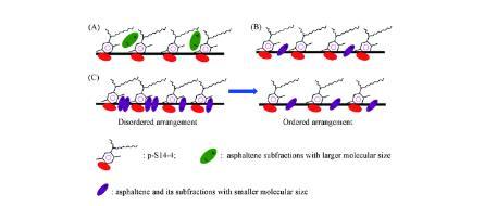 此外,活性分子稀疏地排列在界面上,如圖6(B)所示,并形成稀薄的混合吸附膜。因此,隨著時間的推移,吸附速率和脫附速率達到平衡,IFTs曲線也呈“L”形。在高濃度時,瀝青質組分獲得了較高的能量,能夠突破油水界面能壘,因此這些組分能夠更快地擴散到界面,并與P-S14-4分子無序地排列在界面上。當這些亞組分與P-S14-4分子之間形成了最緊密的混合吸附膜時,明顯的協同作用產生,導致IFT達到最小值。