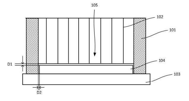 如圖1所示,在一個實施例中,所述筒壁101的材質可以為聚合物、陶瓷、金屬等耐腐蝕的材料,所述筒壁101的形狀例如可以為圓柱狀,所述筒壁101的徑向寬度大于所述晶圓104的徑向寬度,所述筒壁101套設于晶圓104外圍時,所述筒壁101與所述晶圓104邊緣之間的間距D2為30微米~500微米,如100微米、200微米、300微米等,以避免套設時碰撞晶圓104而造成晶圓104或筒壁101的損傷。