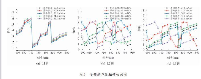 這是由于2個超聲波接收器所接收到的三相超聲波信號傳播所經過的路徑和周期不同,導致對應的相角不同。L2和L3的相頻響應圖變化趨勢無相對明顯的變化規(guī)律,但超聲波信號在傳播過程中由于發(fā)生超聲弛豫、吸收、散射等現(xiàn)象導致相角的不同,其信息包含在相位頻譜中,對于分析變壓器油界面張力具有重要作用。