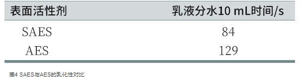 乳化作用是在一定的外力作用下使不混溶的兩種液體形成具有一定穩(wěn)定性的液液分散體系的作用,該分散體系被稱為乳狀液,是一種熱力學(xué)不穩(wěn)定體系。為了評(píng)估SAES和AES的乳化性,采用量筒法測(cè)定了二者對(duì)液體石蠟的乳化能力,記錄從乳液中分離出10 mL水所需要的時(shí)間,時(shí)間越長(zhǎng),乳化性能越好。SAES與AES的乳化性對(duì)比如表4所示。從表中可以看出,SAES的乳化性低于AES,這可能是因?yàn)镾AES分子中的支鏈結(jié)構(gòu),使得其分子總體積相對(duì)較大,在空間位阻以及電性斥力作用使疏水基難以插入油相中,即與液體石蠟之間的相互作用較弱,乳化性較差。