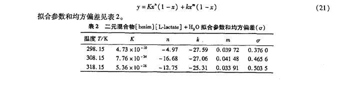 表2二元混合物[bmim][L-lactate]+H2 O擬合參數和均方偏差(σ)