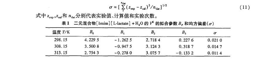 表1二元混合物[bmim][L-lactate]+H2O的V E的擬合參數BP和均方偏差(σ)