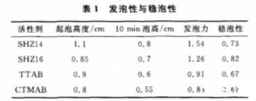 由表1可見:SHZ16的發(fā)泡性比SHZ14差,但穩(wěn)泡性要好于SHZ14,原因可能是隨著泡沫的生成,液體的表面積增加,表面能增加所消耗的能量增加,而且SHZ16的分子比SHZ14的大,那么單個分子的表面積就大,需要克服表面能消耗的能量也大,因此起泡性要差些而穩(wěn)泡要優(yōu)于SHZ14。
