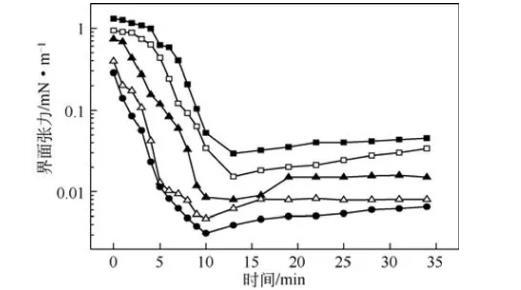 圖7不同助劑對復配體系油/水動態界面張力的影響