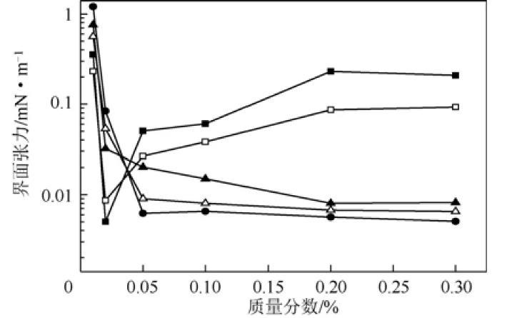 圖2不同烷醇酰胺油/水界面張力穩定值隨質量分數的變化曲線