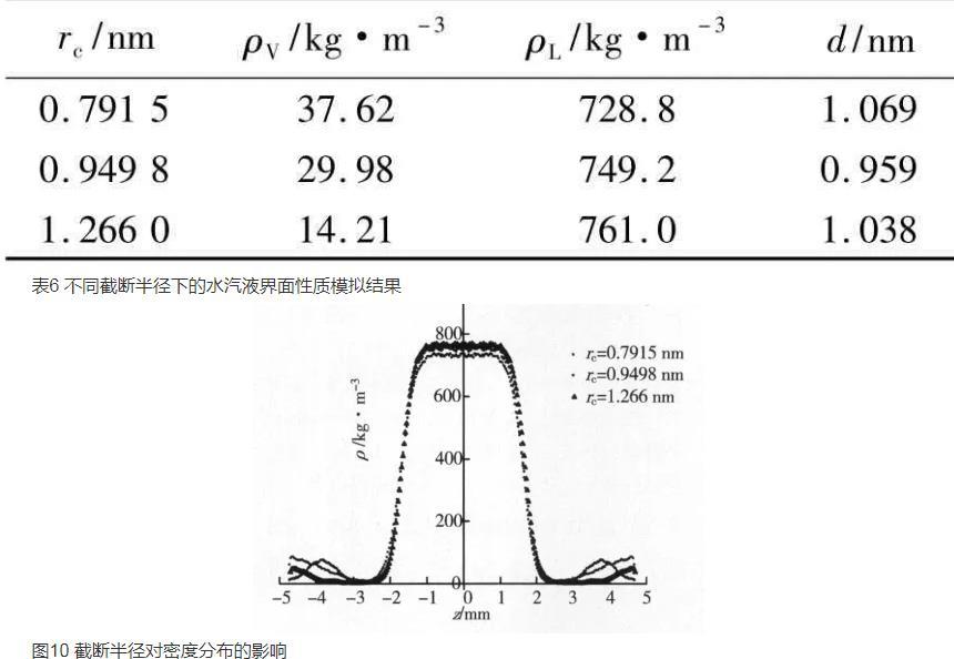 采用SPC模型,對水汽液界面特性的分子動力學模擬研究結果表明,隨著溫度的升高,汽相主體密度增加,汽液界面厚度增大,液相主體密度降低,界面張力逐漸減小,液相主體區域勢能的勢阱深度也逐漸降低。隨著模擬分子數的增加,液相主體密度增加,汽液界面厚度稍有增大。隨著截斷半徑的增加,液相主體密度增加,汽液界面厚度變化不大。