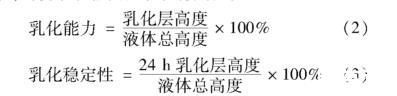 準確稱取1.0 g棕櫚酸木薯淀粉酯,加入一定量的水,于沸水浴中完全糊化,冷卻至室溫。加入20 mL植物油,磁力攪拌2 h,得到均勻乳狀液。將乳狀液轉移至10 mL離心管中,在3 000 r/min轉速下離心15 min,記錄乳化層高度和液體總高度。將乳液于室溫下放置24 h,再以3 000 r/min轉速離心15 min,記錄乳化層高度和液體總高度。平行3次,取平均值。按式(2)和式(3)計算乳化能力及乳化穩定性。