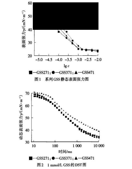 為此,有關連接基的研究較多集中在對靜態性能方面的分析,而對動態性能的研究較少。本實驗對自主研發的乙二醇雙子琥珀酸二仲辛酯磺酸鈉(GSS271)、1,3-丙二醇雙子琥珀酸二仲辛酯磺酸鈉(GSS371)與1,4-丁二醇雙子琥珀酸二仲辛酯磺酸鈉(GSS471)陰離子雙子表面活性劑的DST進行研究,并考察連接基對動態表面性能的影響,探討其吸附動力學機理。