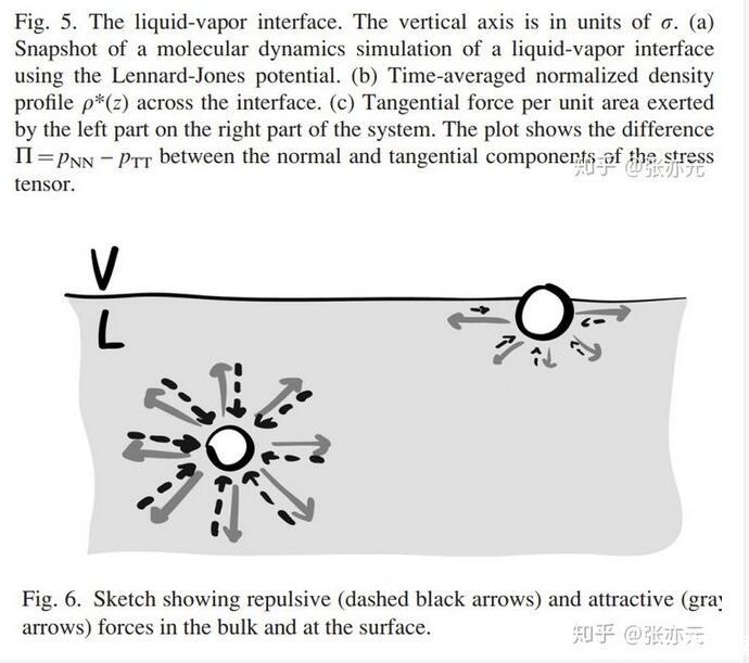 當分子間距較小時,斥力為主,分子間距較大時,引力為主。在斥力與引力平衡時,Lennard-Jones勢能最小。現在,我們就可以來詳細地考慮液-氣界面了。圖5a是通過分子動力學仿真得出的液-氣界面照片,對應的時間平均密度分布圖是圖5b。從高密度的液體到低密度的氣體發生在一個幾個分子厚度的窄區域。為了確定毛細力,我們沿垂直界面方向將系統分為兩個子系統(圖5a)。考慮左邊子系統對右邊子系統的單位面積的作用力,即應力,在豎直方向上的分布。這個力有兩個來源:壓力P和額外壓力Π(圖5c)。圖5c表明有個力局部存在于界面附近,其實這個力就是表面張力,且這個力范圍和密度突變的范圍很相似。這說明表面張力的確是一個真實的力,而不僅僅是表面能的一種純數學描述。既然我們發現在界面附近的確局部存在一個平行的力,那我們回到問題1,為什么表面張力平行于界面而不是垂直于界面?我們注意到圖1僅僅描繪了分子間引力作用。更全面的圖應該如圖6所示,包含了引力與斥力作用。在遠離界面的液體本體內,由于液體分子周圍的完全對稱性,分子的受力完全平衡。但是,靠近界面附近的地方,上下對稱性被打破。為修復豎直方向的力平衡,向上的斥力需平衡向下的引力。而在平行于界面的方向,對稱性仍然存在,平行于界面方向的力平衡仍然存在。這就可以存在一種情況,引力作用的強度與斥力作用的強度不同。實際上,在界面附近的水平方向上,引力作用比斥力更強,這產生了表面張力。