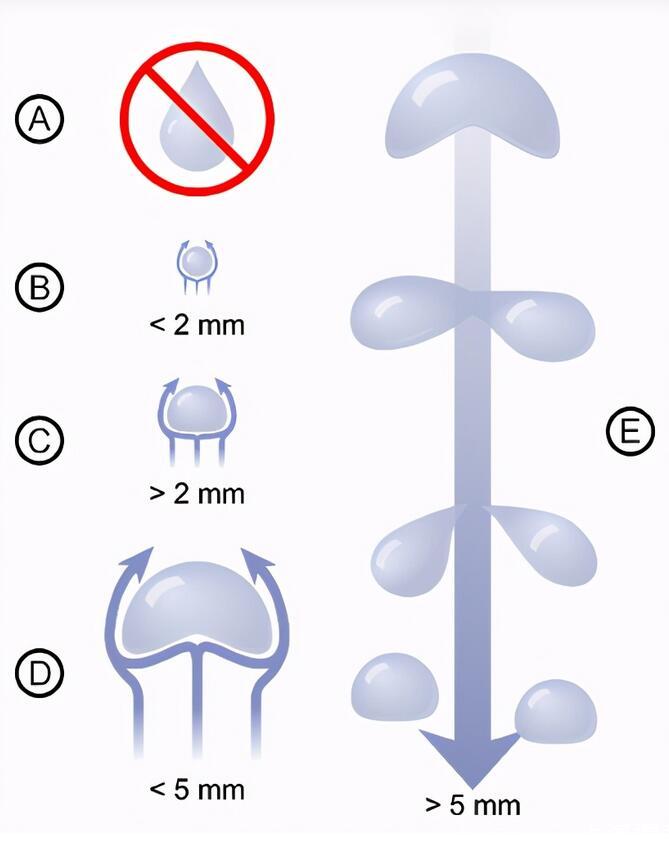雨滴在被分割之前保持著的最大尺寸被稱作為「雨滴臨界破碎尺寸」,物理學(xué)則用「臨界半徑」來表示,在各種不同的氣流條件下,「雨滴臨界破碎尺寸」是不同的: