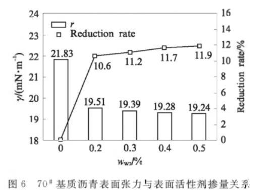 使用改進(jìn)差分毛細(xì)管法,得到不同表面活性劑摻量wW2下B+W2的表面張力值,見(jiàn)圖6.由圖6可見(jiàn):未摻表面活性劑時(shí),70#基質(zhì)瀝青表面張力為21.83mN/m,表面活性劑摻量為0.2%時(shí)B+W2的表面張力為19.51mN/m,表面張力顯著降低,降幅為10.6%;表面活性劑摻量在0.3%——0.5%,表面張力在19.24——19.39mN/m,與70#基質(zhì)瀝青相比,表面張力降幅趨緩,降低幅度為11.2%——11.9%.