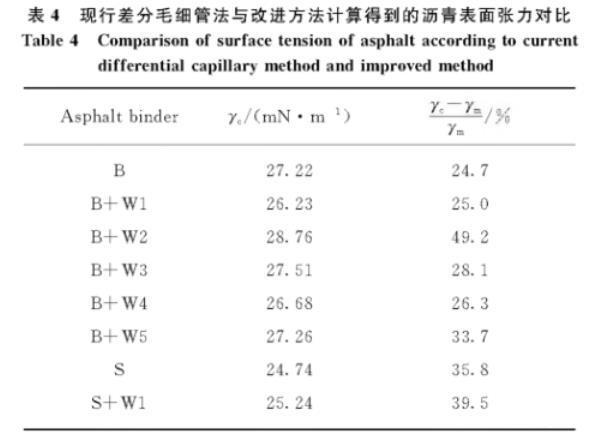 表4現(xiàn)行差分毛細(xì)管法與改進(jìn)方法計(jì)算得到的瀝青表面張力對(duì)比