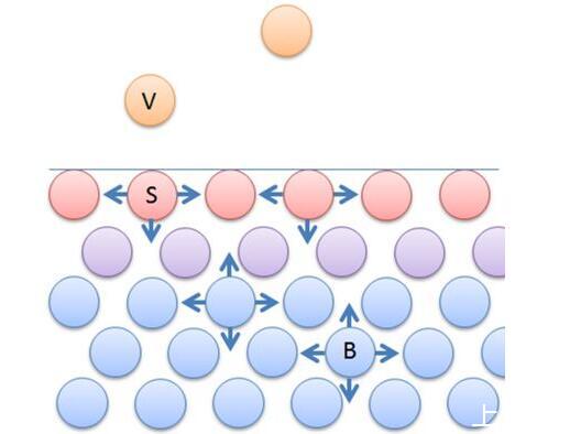 在水中,如B所示,內部水分子所受鄰近相同分子的作用力是對稱的,各方向的力相互抵消。但物質表面層分子與內部分子周圍的狀況不同,水最外層分子會受到整個水滴內部分子的斥力,而抵消這個斥力的便是水的表面張力。