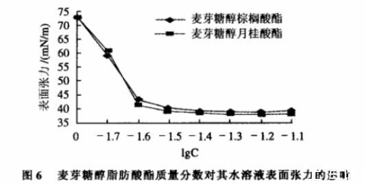 測得本產(chǎn)品麥芽糖醇脂肪酸酯水溶液質(zhì)量分?jǐn)?shù)為0.06%時(shí),表面張力為38~40mN/m。