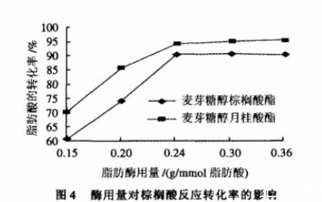 由圖4可見,在本實(shí)驗(yàn)條件下,當(dāng)酶的用量增加時(shí),脂肪酸的反應(yīng)轉(zhuǎn)化率增加。當(dāng)酶的用量為0.24g/mmol脂肪酸時(shí),催化效果最好,棕櫚酸及月桂酸的反應(yīng)轉(zhuǎn)化率分別為達(dá)到90.6%和94.3%。
