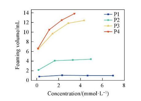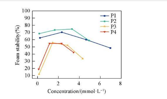 圖6示出4種表面活性劑泡沫穩(wěn)定性隨濃度的變化情況。泡沫穩(wěn)定性隨著濃度的增加先升高至最大值后又降低。這是因?yàn)楸砻婊钚詣┑奈綄?dǎo)致了Gibbs-Marangoni效應(yīng)。當(dāng)液膜受到?jīng)_擊局部變薄時(shí),產(chǎn)生表面張力梯度,導(dǎo)致鄰近區(qū)域吸附的表面活性劑攜帶水化層向薄膜處遷移,以恢復(fù)原來的表面張力并修復(fù)液膜。在較低濃度時(shí),表面活性劑濃度的增加使得Gibbs-Marangoni效應(yīng)隨之加強(qiáng),進(jìn)而有效阻止液膜變薄,增加泡沫的穩(wěn)定性。當(dāng)濃度大于cmc后,溶液中的表面活性劑分子能夠快速吸附在界面處,使得Gibbs-Marangoni效應(yīng)減弱,泡沫穩(wěn)定性降低。在4種表面活性劑中,P2的泡沫穩(wěn)定性最強(qiáng),這可能是由于分子在空氣/水界面上排列最緊密,形成的液膜強(qiáng)度更大,因此泡沫不易發(fā)生破裂。