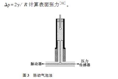 脈動氣泡法測量裝置如圖3所示。待測試液置于小體積的樣品室中,樣品室通過垂直毛細管與環境空氣連通。脈動器活塞的運動在腔室中產生負壓,導致空氣被吸入毛細管形成氣泡。當活塞來回移動時,氣泡會產生脈動,從而模擬呼吸動力學。通過脈動器的預設程序改變氣泡半徑R,并且由壓力傳感器記錄氣泡周圍的壓力,根據拉普拉斯定律Δp=2γ/R計算表面張力。